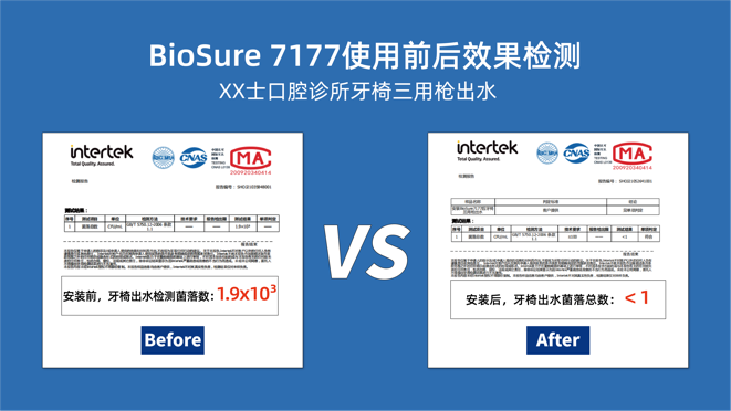 可以看到,使用BioSure7177水路管线杀菌系统,可以把牙椅用水变成一种安全有效的消毒剂,有效降低水路管线生物膜的发生概率,同时使用后无化学残留,安全可靠,可以实现齿科水路管线全方位杀菌消毒。